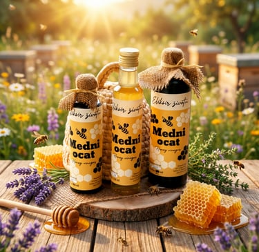 Medeni ocat je jedinstveni prirodni eliksir nastao spajanjem meda i tradicionalnog procesa fermentacije, koji stvara osvježavajući, lagano kiselkast napitak bogat enzimima, mineralima i prirodnim kiselinama. Za razliku od klasičnih octeva, medeni ocat ima nježniji okus, topliju aromu i dodatnu nutritivnu vrijednost zahvaljujući medu koji mu daje posebnu punoću.